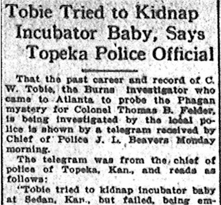 Заголовок статьи, опубликованной в газете «Atlanta Journal» 26 мая 1913 г., гласит: «Полиция Топики официально сообщает о том, что Тоби пытался похитить младенца». И вот такие люди, как частный детектив Тоби крепили законность на просторах США от Атлантического океана до Тихого!