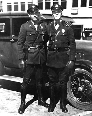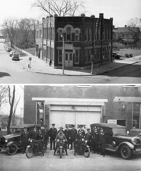 Вверху: здание Департамента полиции города Парк-Ридж, штат Иллинойс, в 1931 году. В этом же здании размещались городская администрация и пожарный отряд. Ввиду тесноты эти службы сидели буквально на головах друг друга. В 1940 году эта постройка была снесена и под ней возвели большой подземный резервуар для городского водопровода. Внизу: наряд полицейских сил в Парк-Ридж, заступавший на смену, был сравнительно невелик - менее 20 человек. Фотография сделана около 1920 года позади здания, изображённого на снимке выше. В 1931 году дежурная смена полицейских сил не увеличилась, хотя криминогенная обстановка значительно усложнилась.