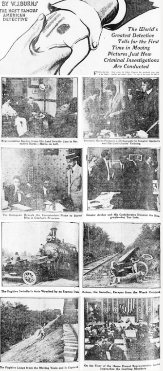 В конце октября 1912 г. Уилльям Барнс представил в газетах фото-"комикс", посвященный расследованию мошенничеств с землёй фирмы «Nelson Land Company» и участию его детективного агентства в разоблачении махинаторов. Нельзя не поражаться самодовольству прославленного сыщика и его потребности в самопиаре.