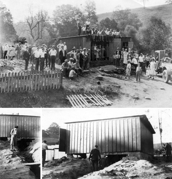 Несколько фотографий гаража Гарри Пауэрса в поселении под названием Кьюит-делл (Тихая лощина). Снимки сделаны в последние дни августа 1931 года. На нижних фотографиях можно видеть траншею для канализационной трубы, вскрытую сотрудниками правоохранительных органов ранним утром 28 августа.