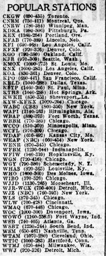 Список популярных радиостаннций в диапазоне длинных волн, которые жители северо-американского континента слушали в конце 1920-х и в начале 1930-х годов. Нетрудно заметить, что радиостанций было не много, а очень много и они представляли собой профессиональные, компетентные и хорошо оснащенные журналистские коллективы. Радиовещание являлось серьёзной силой, конкурировавшей с печатными изданиями, и главным достоинством радиожурналистов являлавь возможность давать информацию в эфир немедленно, не привязываясь к ритму работы типографий.
